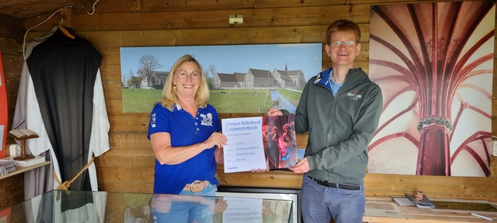 Uitreiking cheque Rabobank Coöperatiefonds t.w.v. 2.500 euro door Pep de Boer aan Hylco Bouwstra in het informatiepunt van Bloemkamp. Namens het stichtingsbestuur hartelijk dank voor de steun van de Rabobank voor het oprichten van het belevingspunt Bloemkamp!