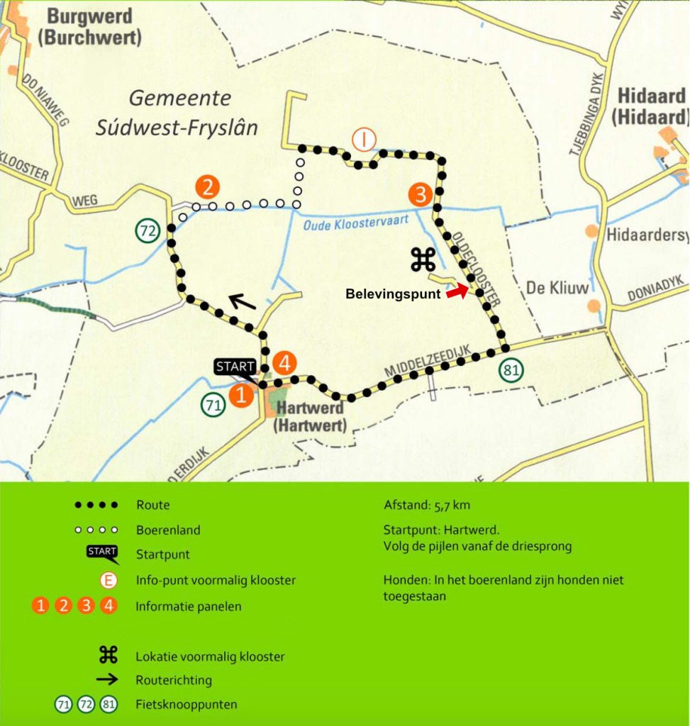 Het Oldecloosterpad slingert zich vanuit het kleine dorp Hartwerd een weg door een open en weids landschap. In een zee van gras staan de boerderijen onder hoge luchten als oases van rust in het veld. Door boerenland en langs een lang verdwenen klooster voert het pad over een oude Middeleeuwse dijk terug naar het dorpje Hartwerd.