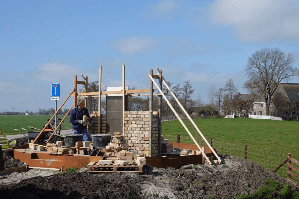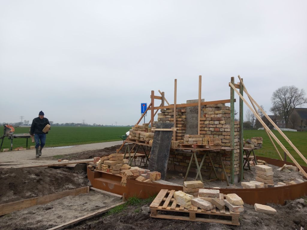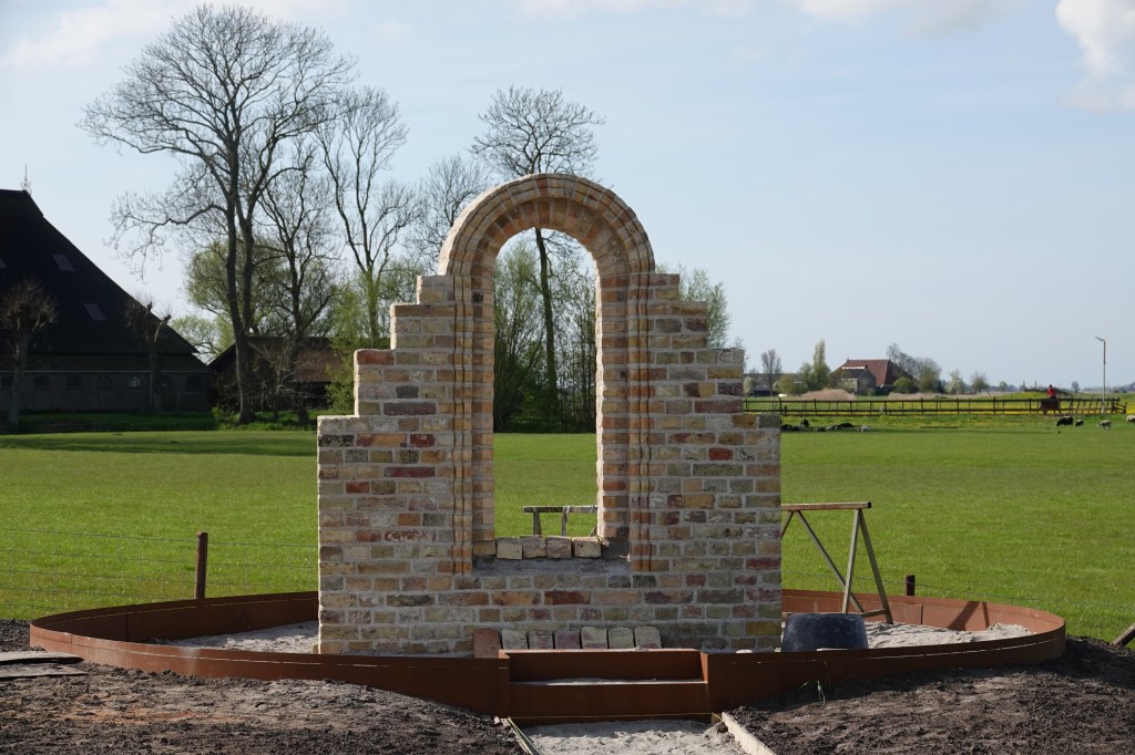 7 en 8 april 2023 – Het metselen van het venster van het Belevingspunt Bloemkamp is grotendeels gerealiseerd i.s.m. Dirk Schram die gespecialiseerd is in oud restauratiemetselwerk en met hand en spandiensten van het bestuur van de stichting. Dankzij een last minute schenking van een aantal oude gele kloostermoppen afkomstig van Titus Hettinga waren er net genoeg stenen om het bouwwerk te kunnen maken. Op dinsdag 11 april zal er verder gewerkt gaan worden aan de halfronde boog van het venster. De voegen zullen bestaan uit authentieke kalksteenmortel met schelpen zoals in de Middeleeuwen gebruikelijk was.