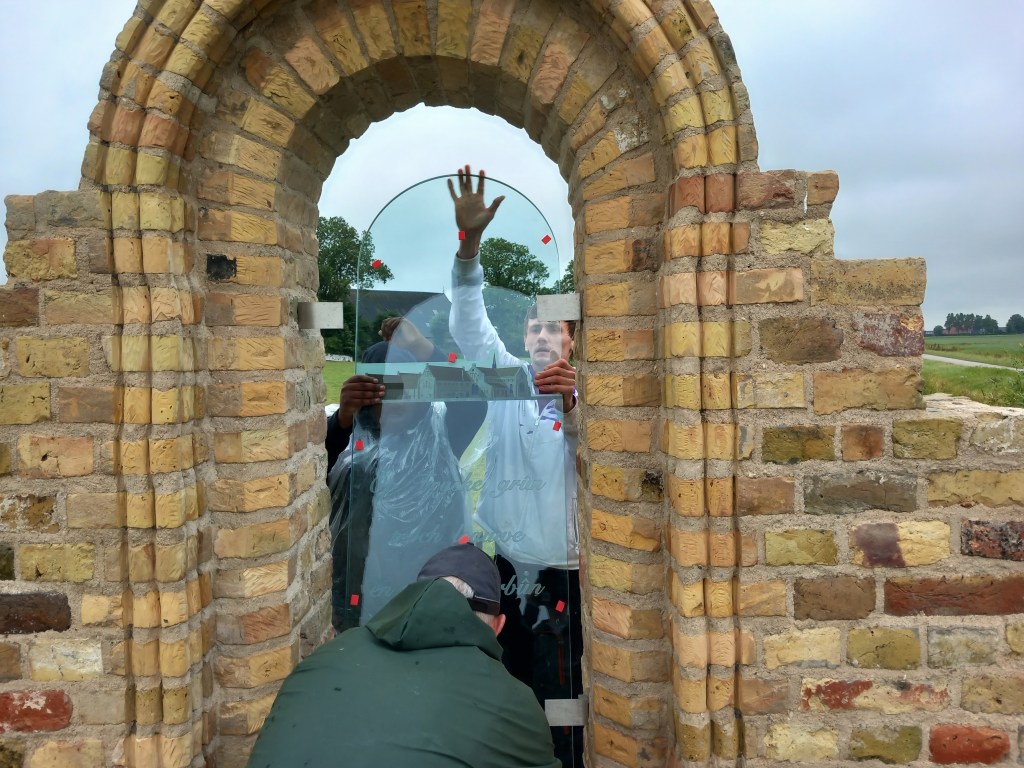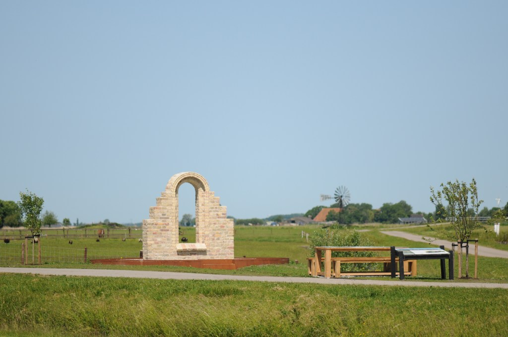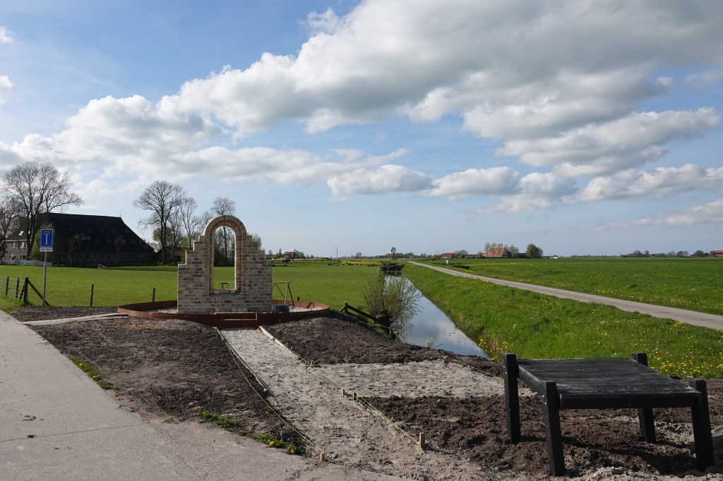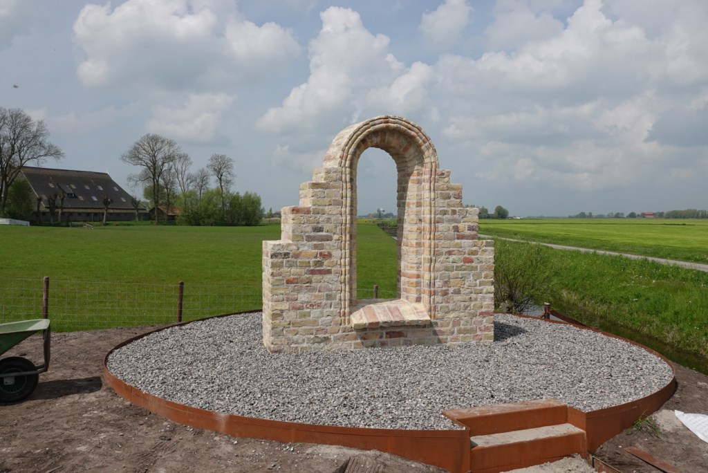 19 april 2023 – Rondom het Belevingspunt is de grond aangebracht. Het bijbehorende informatiebord is afgedrukt. De maten van het glas zijn doorgegeven aan de glazenier. De speciale schelpkalk voegmortel is besteld.