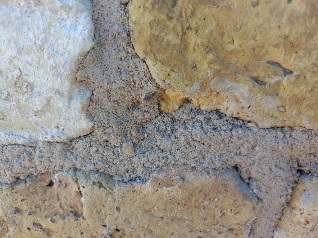 29 april 2023 – Het voegen met de speciale schelpkalk voegmortel van de Mortal Compagnie is bijna geheel af. De vensterbank stenen zijn op maat gemaakt. Het lessenaar bord voor het informatiepaneel is geplaatst en de grond rondom is verder afgewerkt als voorbereiding op werkzaamheden van Bonnema Túnoanlis.