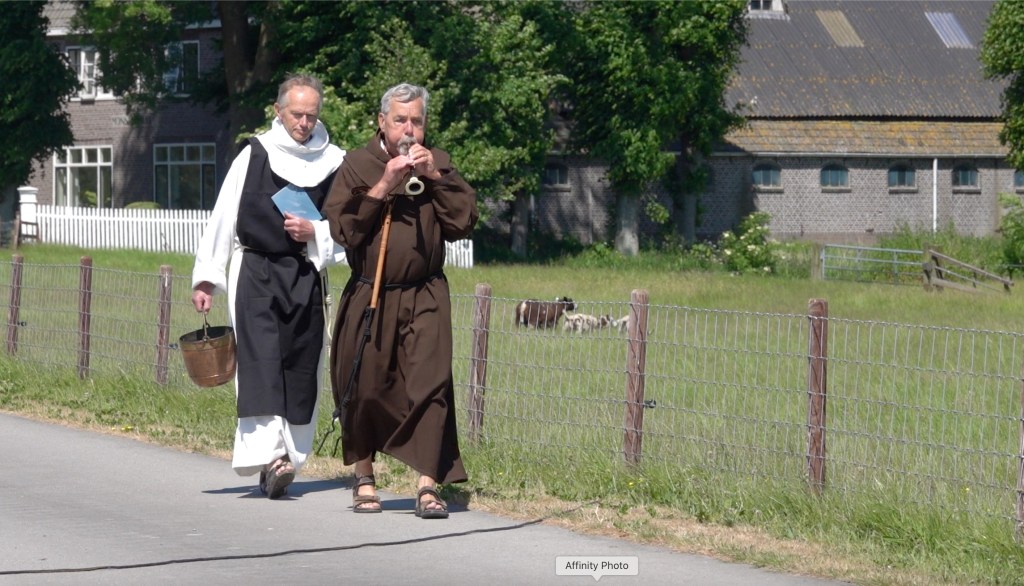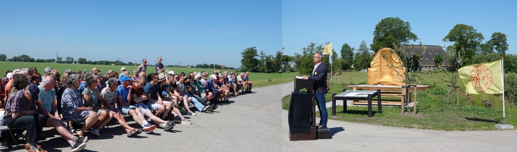 Yn oanwêzichheid fan rom 90 besikers iepene Pyt Jaarsma, foarsitter fan de Stifting Monumint Aldekleaster de byienkomst. Tegearre mei prof. Hans Mol ûntbleaten hja in monumintsje fan stiennen dy’t noch út it kleaster komme. Dêryn komt noch in glêsplaat, dêr’t jo it kleaster wer troch lizzen sjogge op it plak dêr’t it stien hat. Dat de glêsplaat noch net levere wie, is spitich mar mei it byldzjend kleasterferhaal hjir op lokaasje koe Hans Mol de tahearders in goede yndruk jaan fan de kleasterbewenning ek yn relaasje mei de skiednis fan Fryslân. Hielendal byldzjend waard it doe’t abt Theodurus (Titus Hettinga) mei in fluitspyljende muonts (Bernard Visser) del kaam om it monumint yn te segenjen. De wize abt wist ek te fertellen wêrom’t it glês noch net levere wie: hjir hiene de fetkeapers grif de hân yn hawn. Nei in moaie taspraak en in ludike ynseging fan it monumint, betanke de foarsitter de oanwêzigen. Alle gasten krigen in oantinken mei yn de foarm fan it boekje ‘It Aldekleaster by Hartwert’ skreaun troch Sijke Kooistra. It is in fraai boekje oer de skiednis fan it kleaster mei dêryn in kaartsje fan de Aldekleaster kuierrûte dy’t û.o. lâns it nije monumint fiert. It boekje is foar in elk dy’t nijsgjirrich is nei de kleasterskiednis te krijen foar € 2,– troch te mailen nei belevingspunt.bloemkamp@gmail.com en de opbringst is foar it ûnderhâld fan it Belibbingspunt.